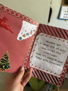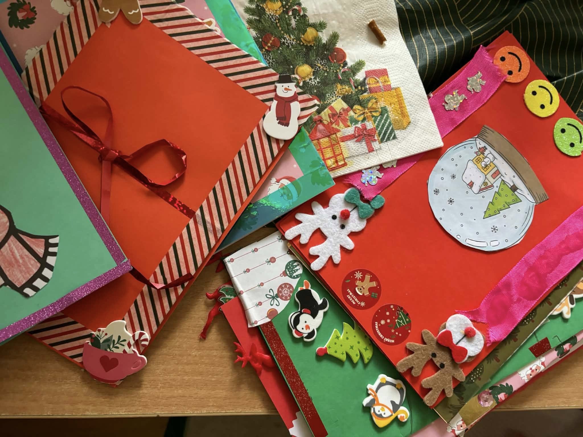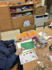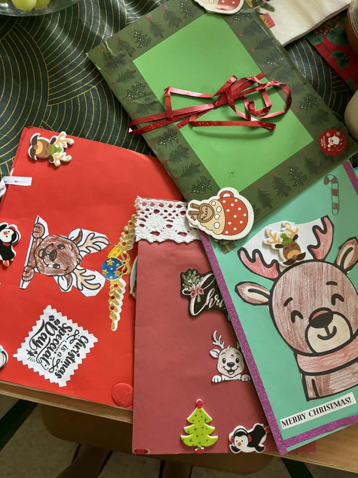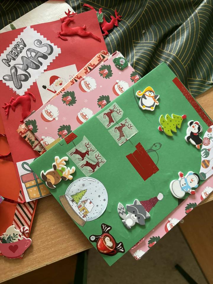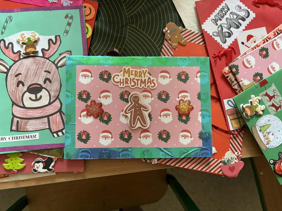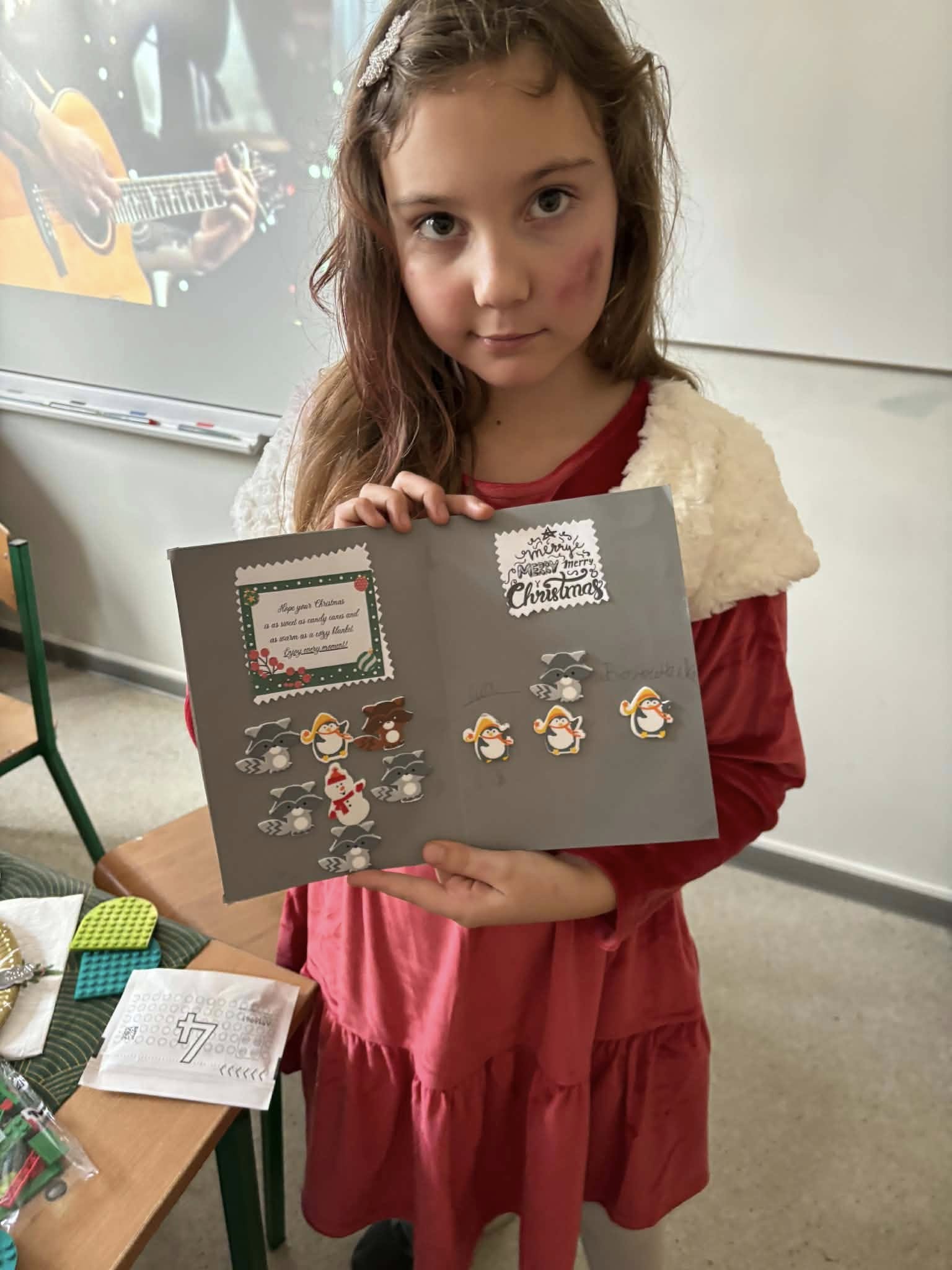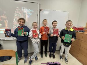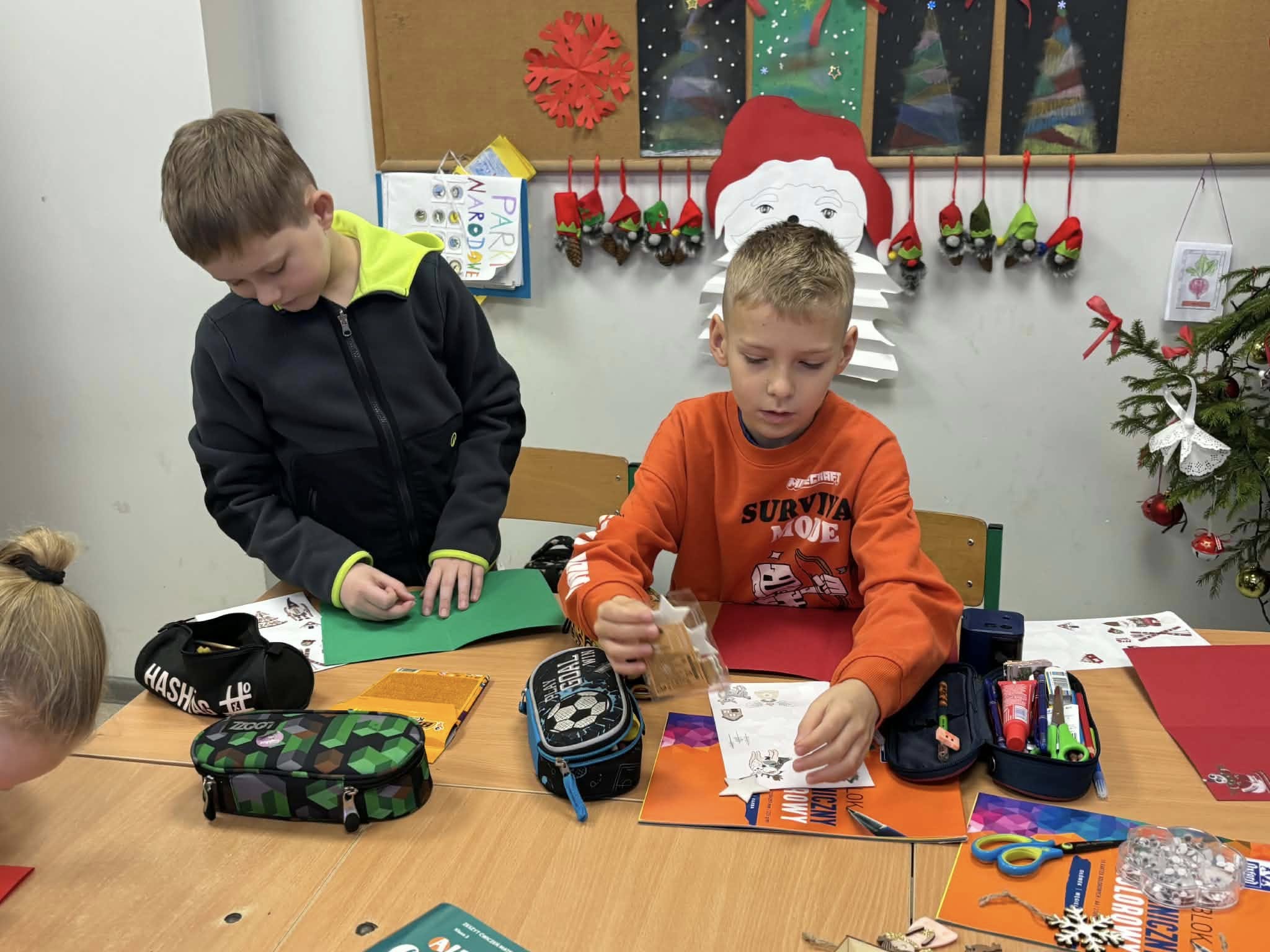 Dzieci własnoręcznie przygotowały kartki oraz napisały świąteczne życzenia w języku angielskim, ćwicząc w praktyce swoje umiejętności językowe i poznając rówieśników z innej szkoły.