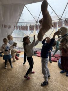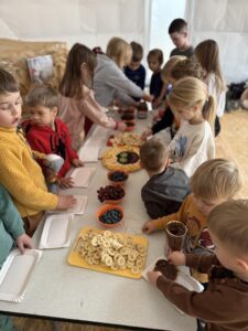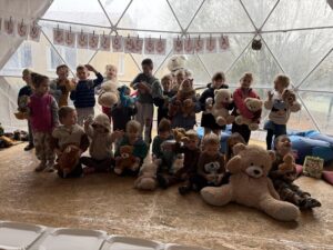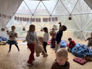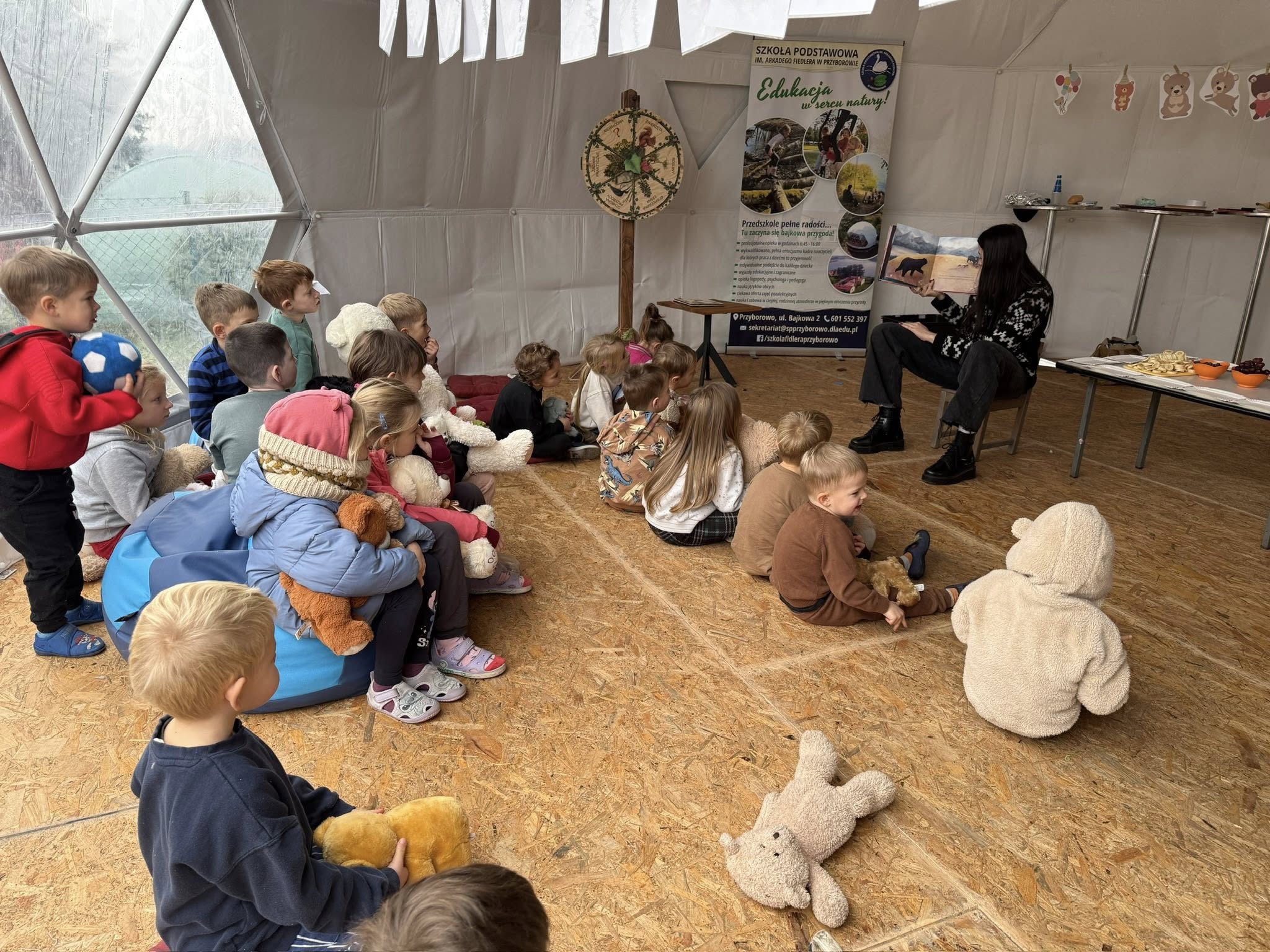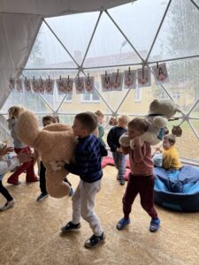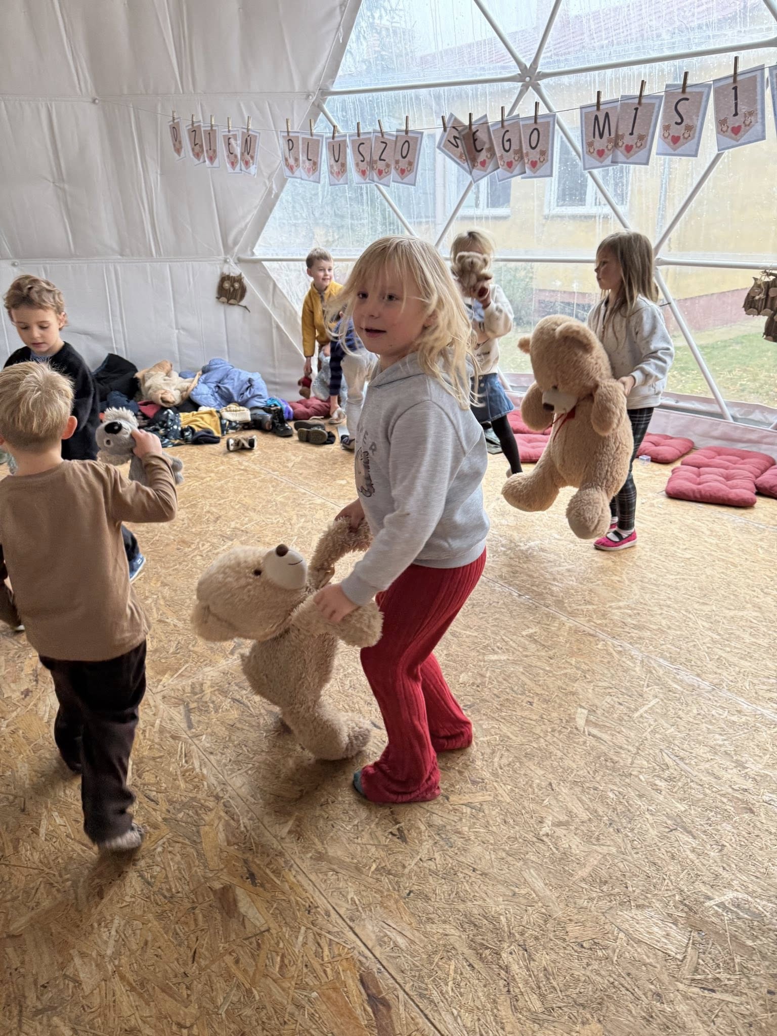Były tańce z misiem, czytanie opowieści o niedźwiadku, misiowe rozmowy i mnóstwo radości. Przedszkolaki przygotowały także pyszne, kreatywne tostowe kanapki z czekoladą i owocami – każda z nich zamieniła się w uroczą misiową buźkę.